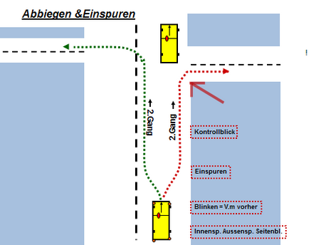 Bei starken Abbiegungen wenig oder nicht Einspuren damit der Gegenverkehr in der Querstrasse weniger behindert wird !